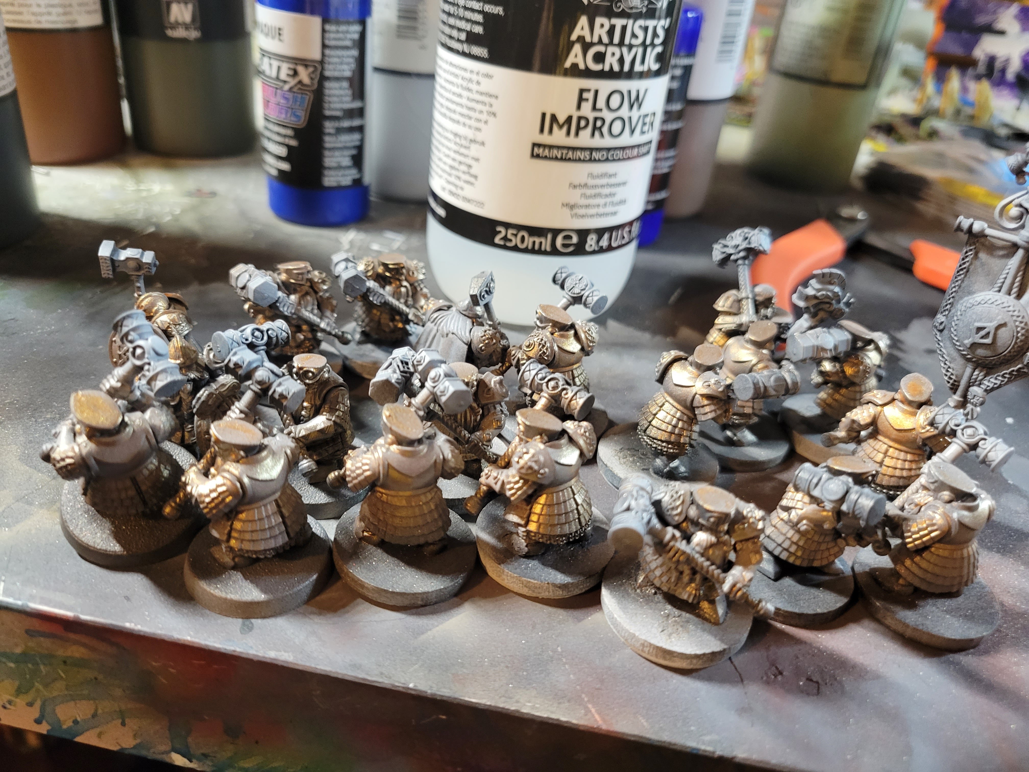 The streak begins with a few minor models. I cleaned up my hobby space which was littered with 6 months of clutter from no work being done. I filled up my water cup and wet palate put the paints where they belonged, and threw away the accumulated garbage. I am starting with a set of 10 dwarven warriors with great axes on square bases. I do 10 because that is the typical unit size in Age of Sigmar, and I have 3d printed tons of base adapters. You can go from a square base to a round base but not a round to a square, so I use square.