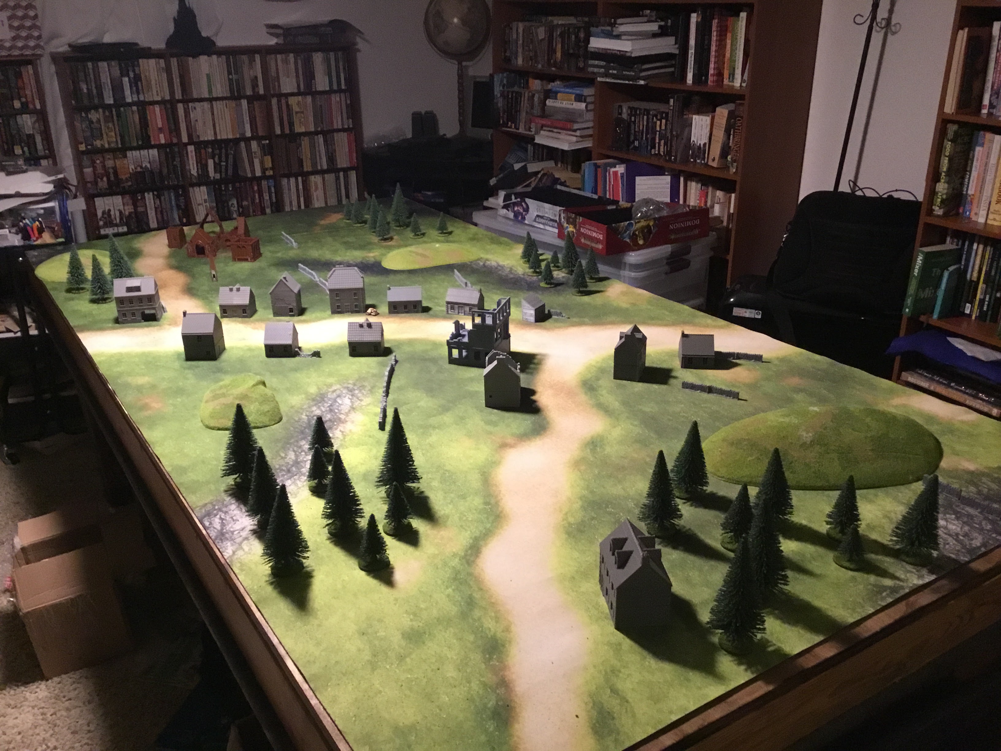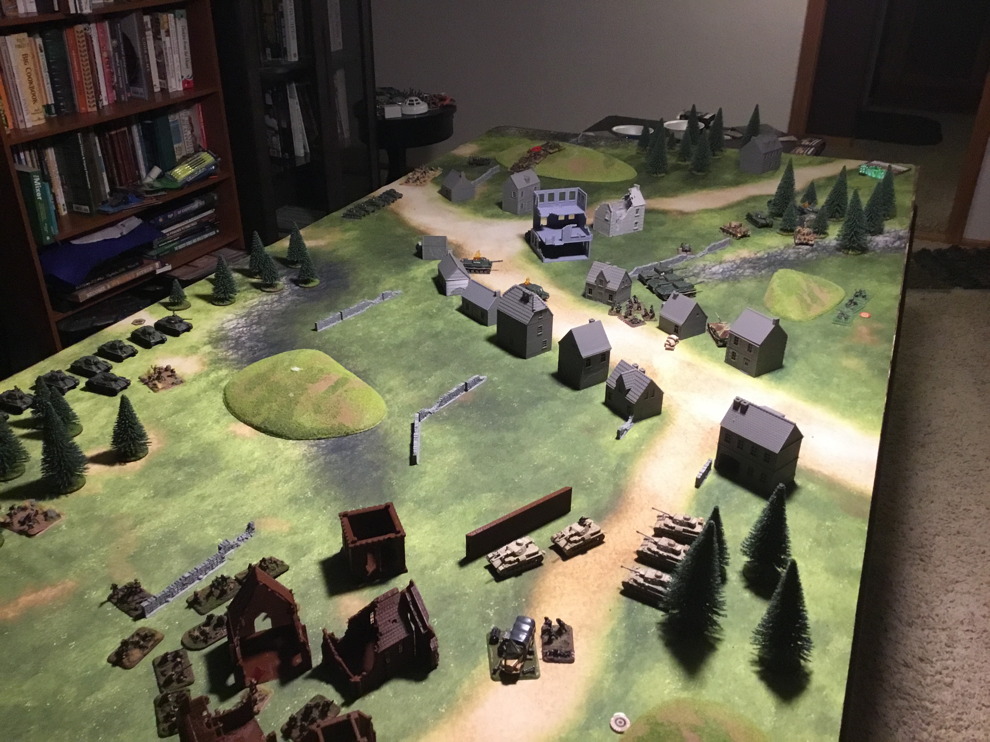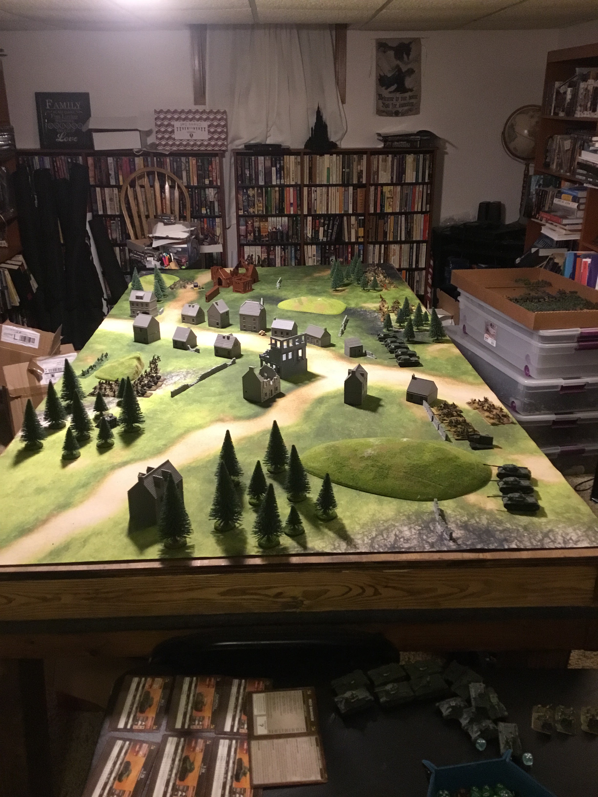 As many of you know, I have been teaching myself how to play flames of war. I did the basic annihilation battle a week ago and wasn’t impressed with the ruleset. I felt that the game played simple and there was little room for tactics beyond flanking. I wished you could do things like pin tanks with mortar fire etc. However, I started the 2nd game and probably a 3rd to get a better feel for the system. I have to say the Encounter battle we faced seemed much better. The forced reinforcements add a ton to the game. I also learned how important terrain would be. I felt like the more open game was just a waste of time. Adding woods, houses walls ruins added a significant amount as well. Below is the updated setup.