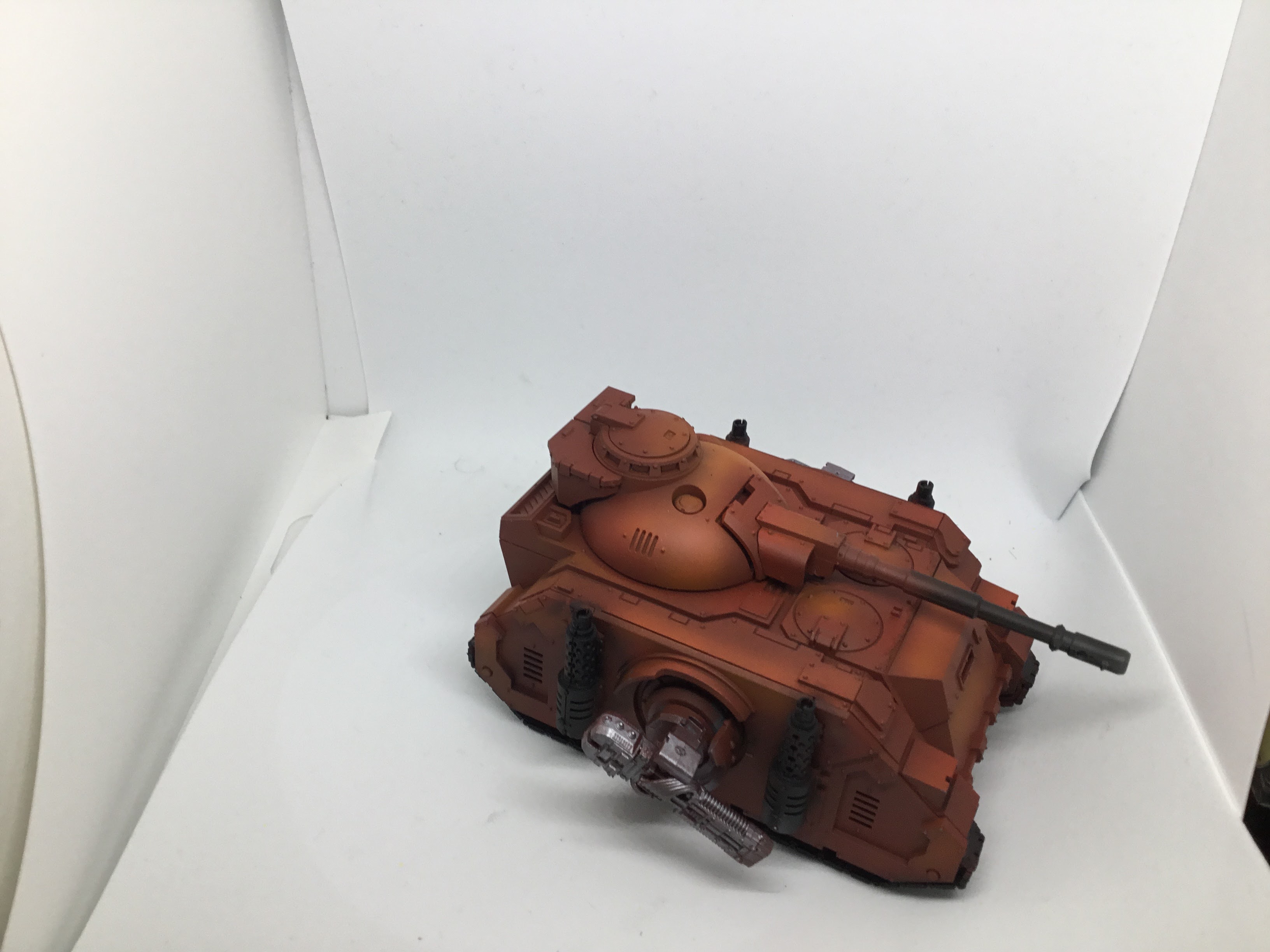 My 100% airbrushed marine makes me much happier. Base/primer coat of Vallejo German brown. Followed with Vallejo Game Air Blood Red and finished with Safety Orange from Army Painter Airbrush paint series. Used Grim Black from speed paints on the blacks. Silver from Vallejo game air on the silvers, and some Army Painter Red Tone for a little more detail. I underpainted it with a shot of Vallejo Royal Purple.