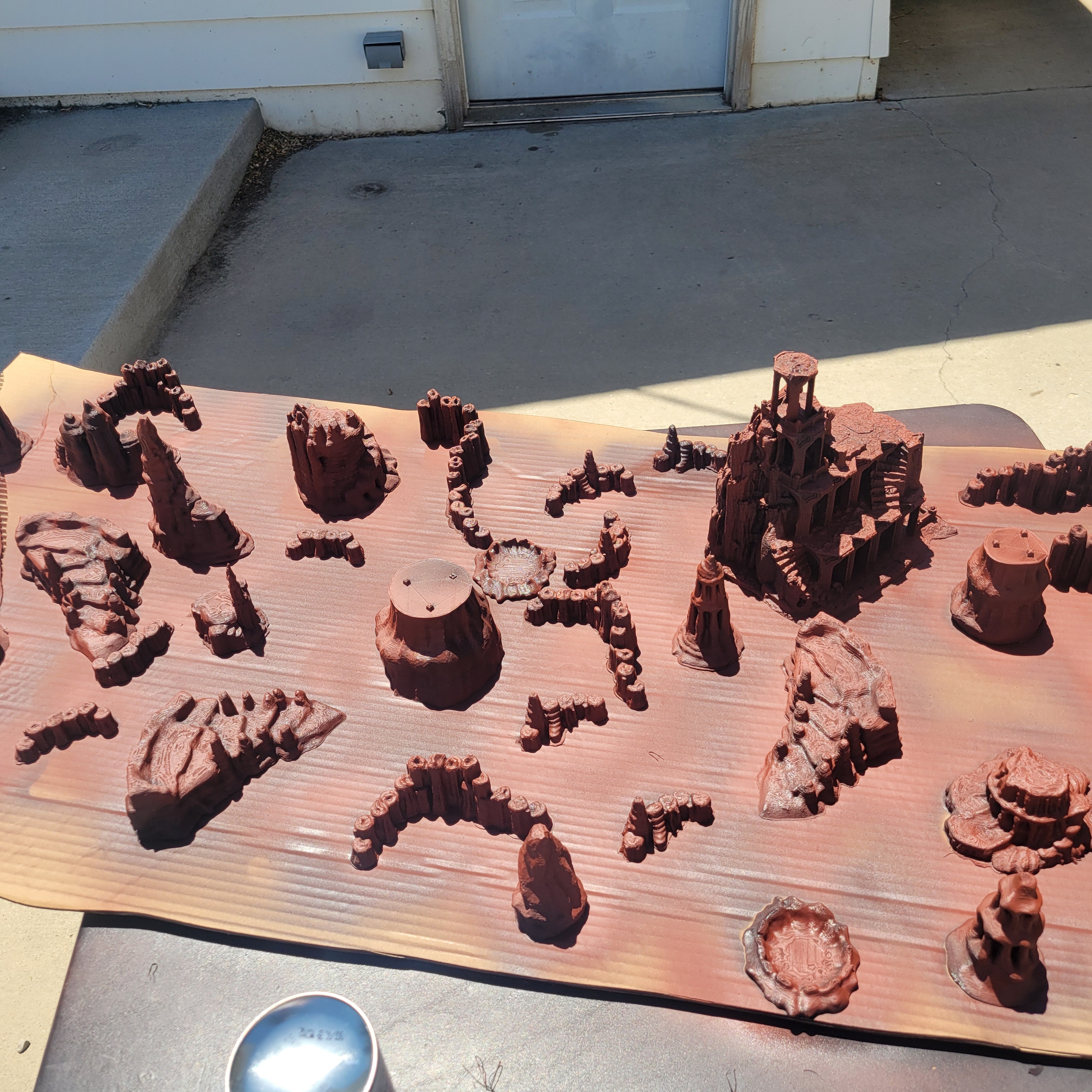 All the terrain comes from Brander Roullette on Myminifactory. https://www.myminifactory.com/object/3d-print-star-wars-legion-geonosis-spires-and-terrain-188409