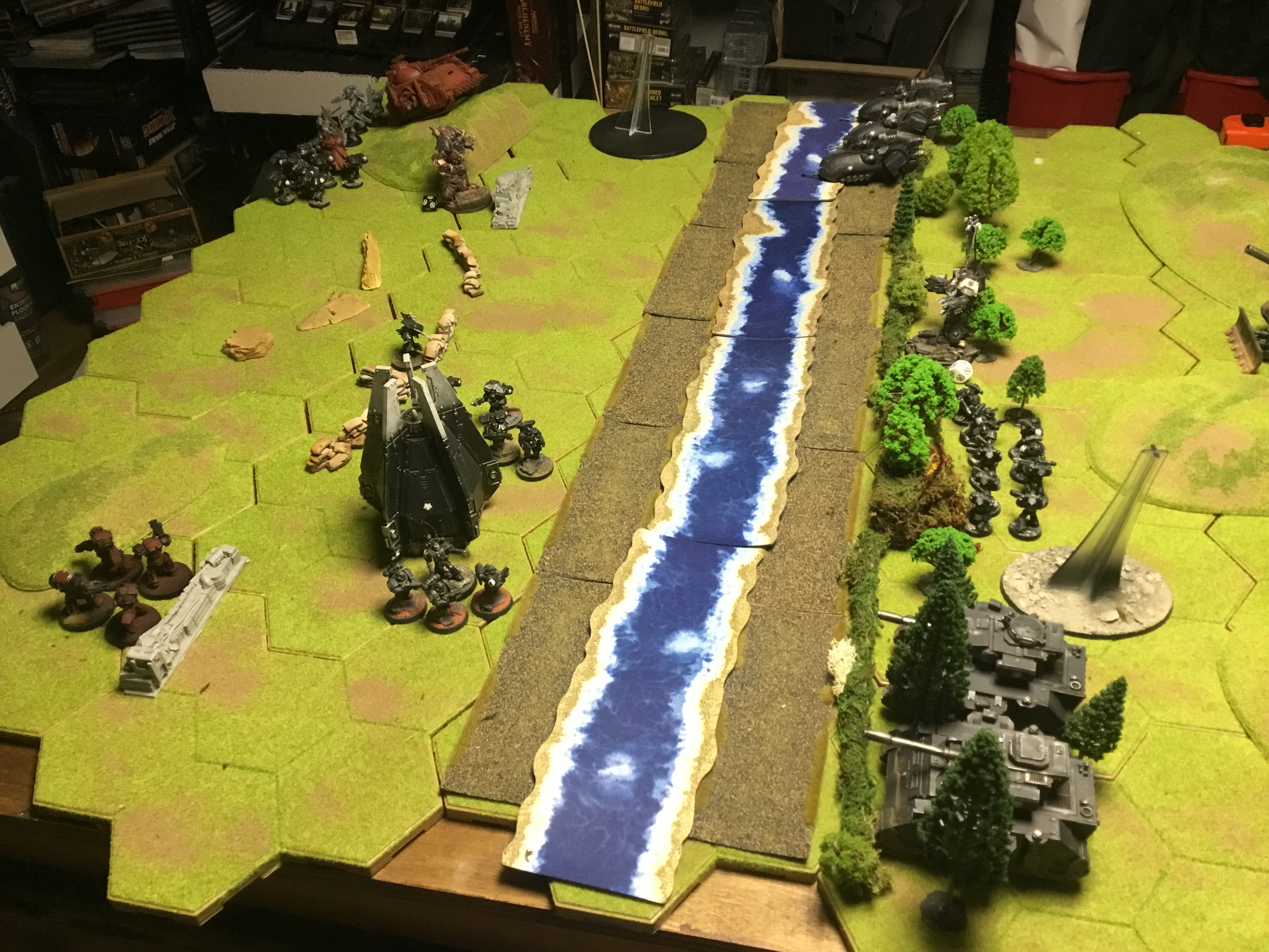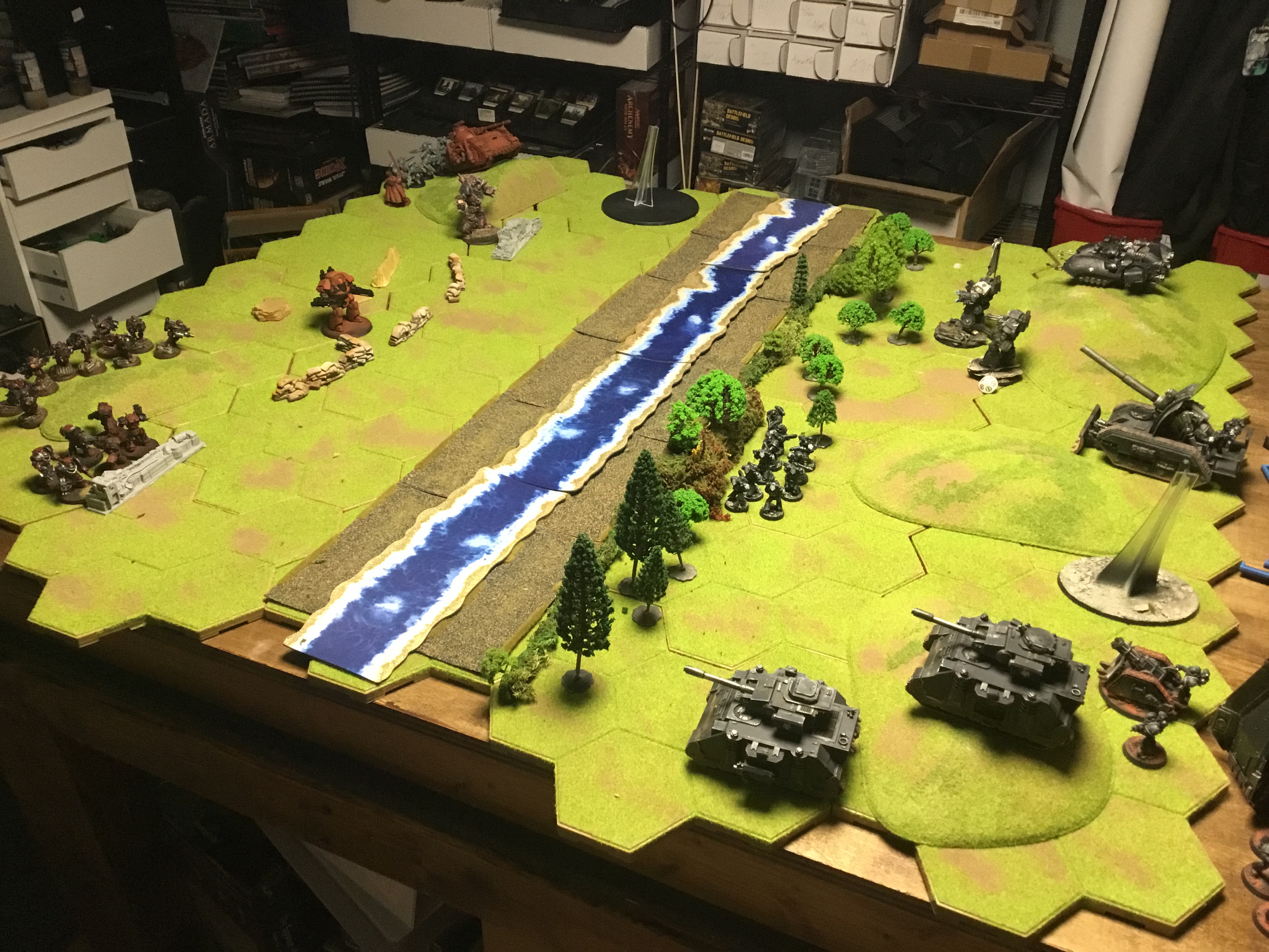 The Ravenguard are attempting to cross into the city. The Word Bearers are holding. Teams get 1 VP for each unit destroyed and 1 VP for each unit on the Word Bearer side of the river.