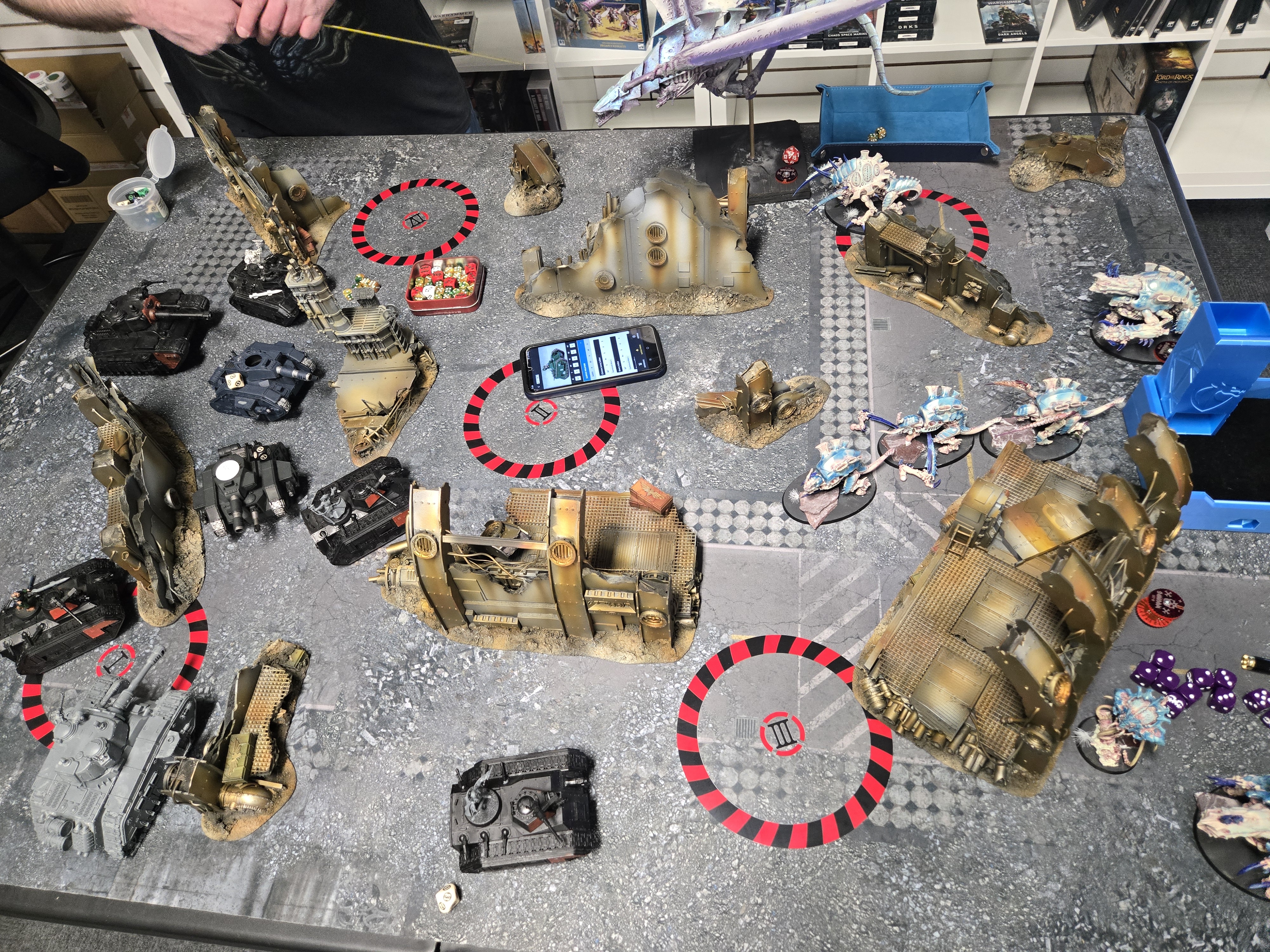 In squad actions, scatter terrain is vital. Broken furniture, light poles, crates, rubble, craters, computer terminals, and market stalls. When you only have 10 figures on the table, you can take your time to enhance some of the details. It generally leads to much more interesting games.