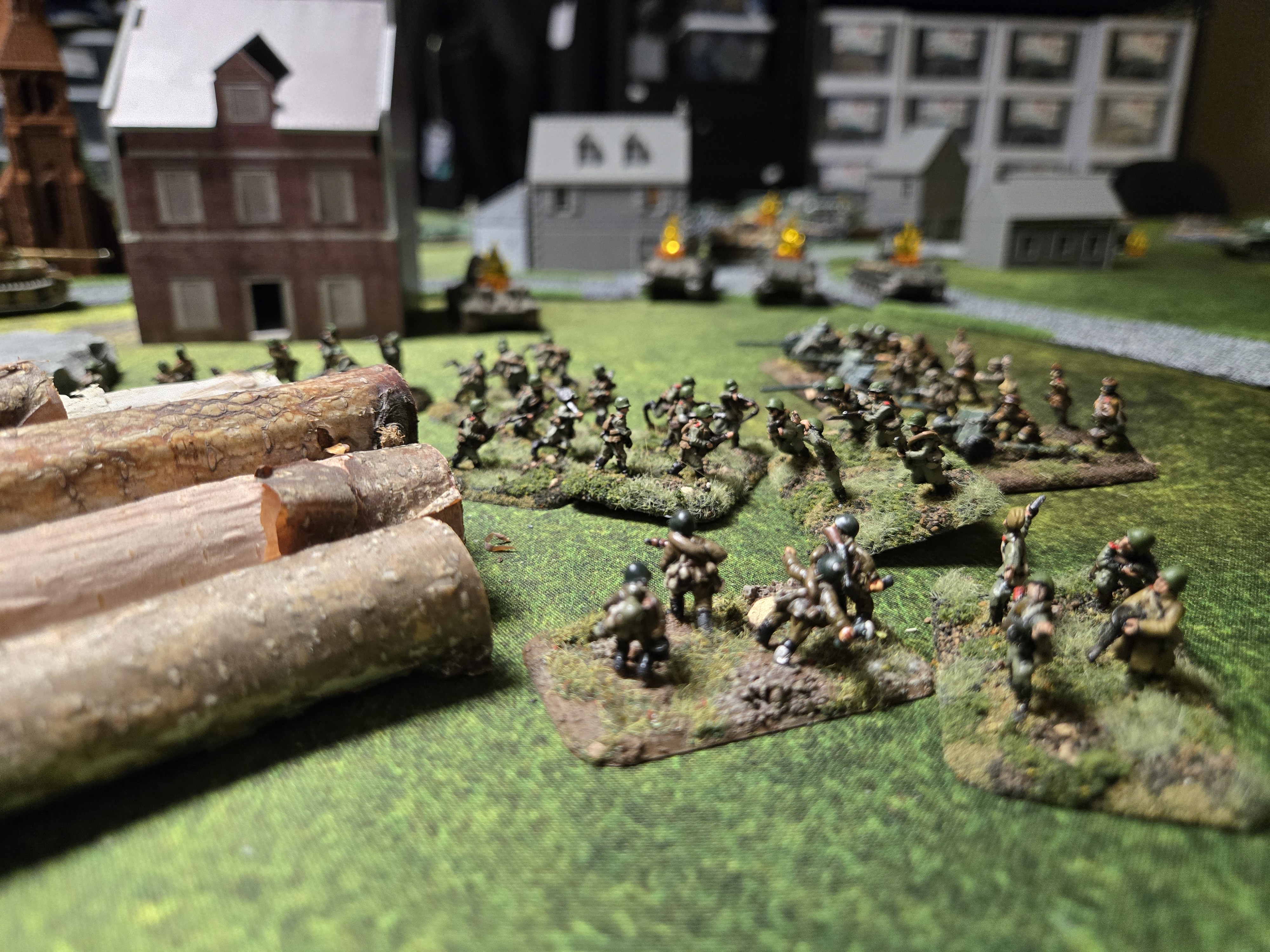 Turn 3. Apparently, 4 tank hunter teams (side armor), and an artillery strike can destroy a Tiger Tank. I didn’t take many good pictures on the bottom of the board, but one of the up-gunned T34s also destroyed a Tiger. At this point, I didn’t have a plan for the Germans to win. Instead they just destroyed as much as possible and try not to lose.