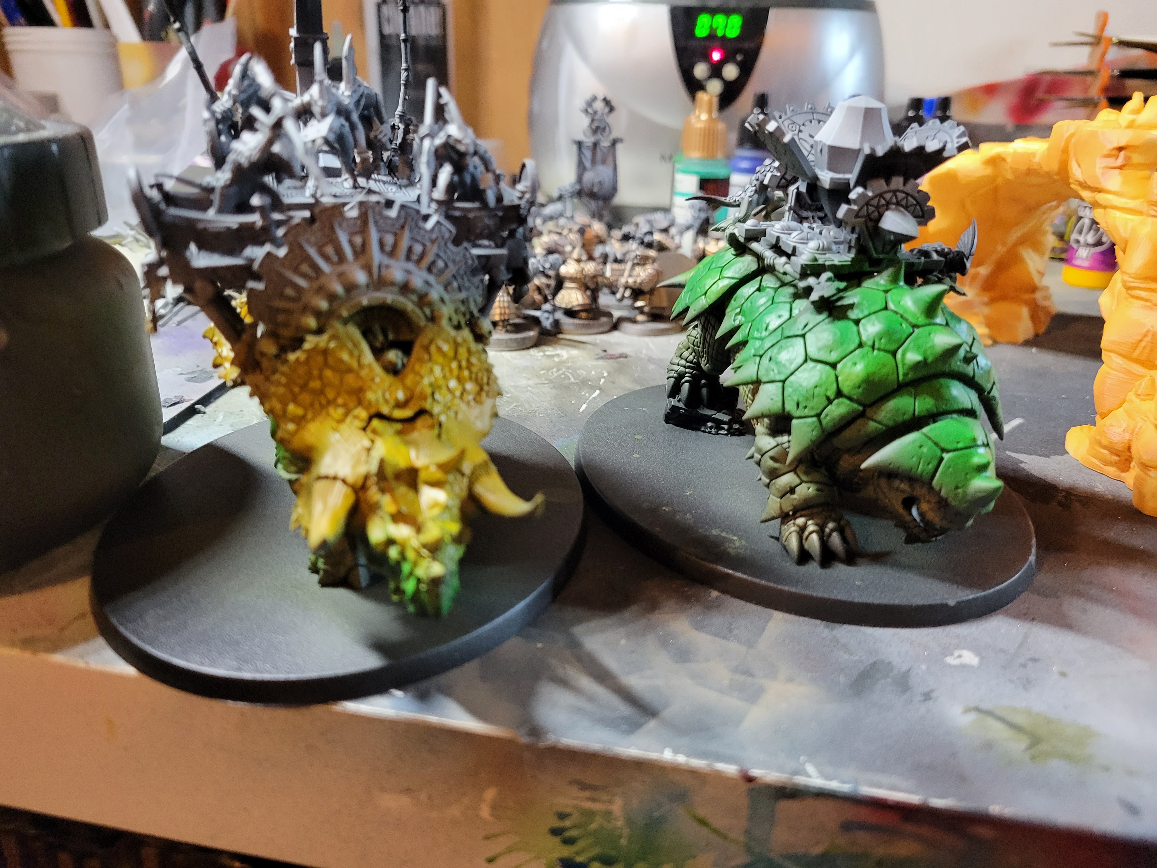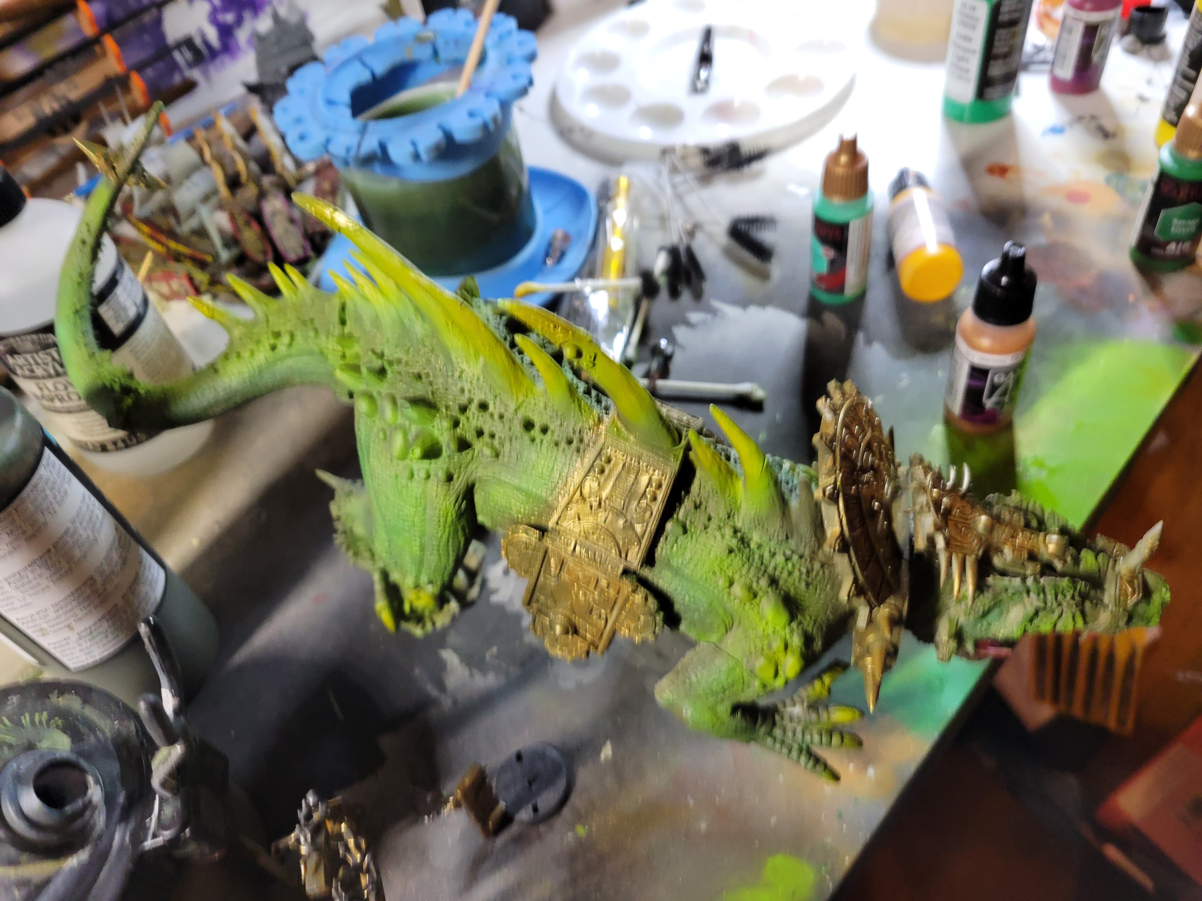 Primed with Vallejo Forest green primer, it also provided a nice basecoat. From there I mixed in various greens building up highlights and finished with the vallejo golden yellow you see on its side in the second pic. I added some gold fir the fixtures. I honestly think after a wash and some face and mouth detail work this model will be in good shape.