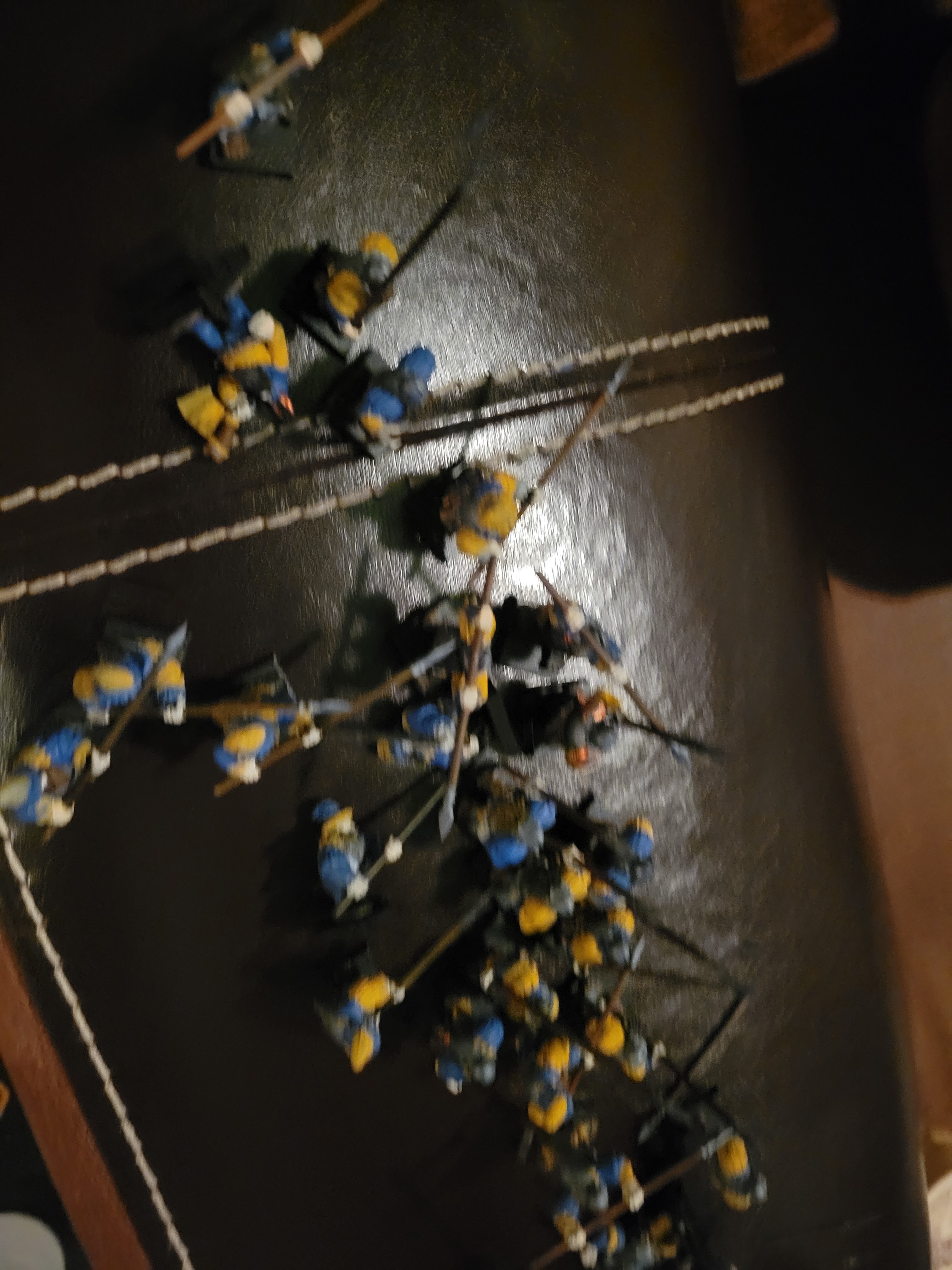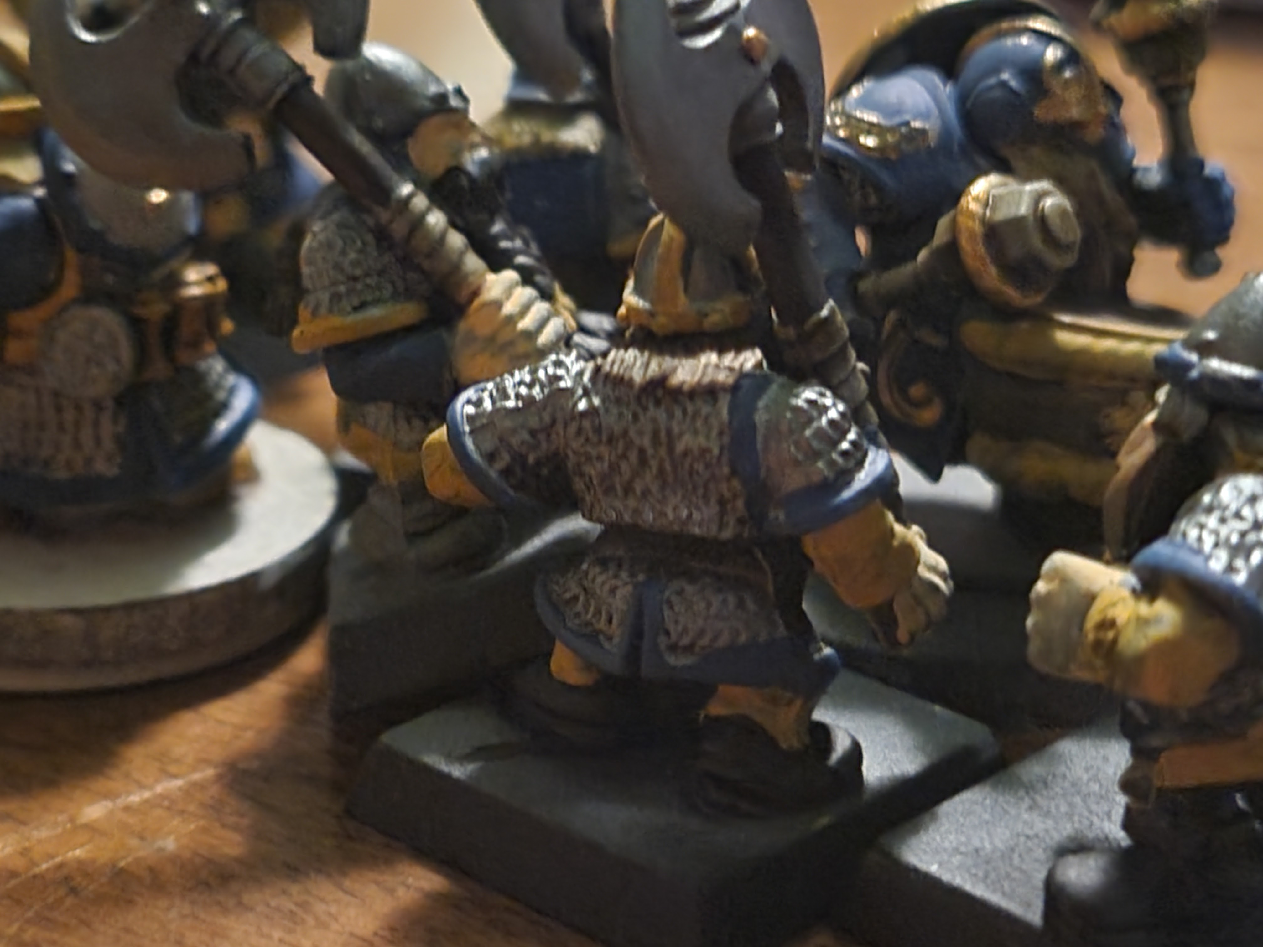 On the 29th I pushed out 10 dwarves with great weapons. My classic zenithal prime. Various contrast paints for the browns and hair. Vallejo Opaque Blue and Yellow. And some Reaper Bones darkened steel.