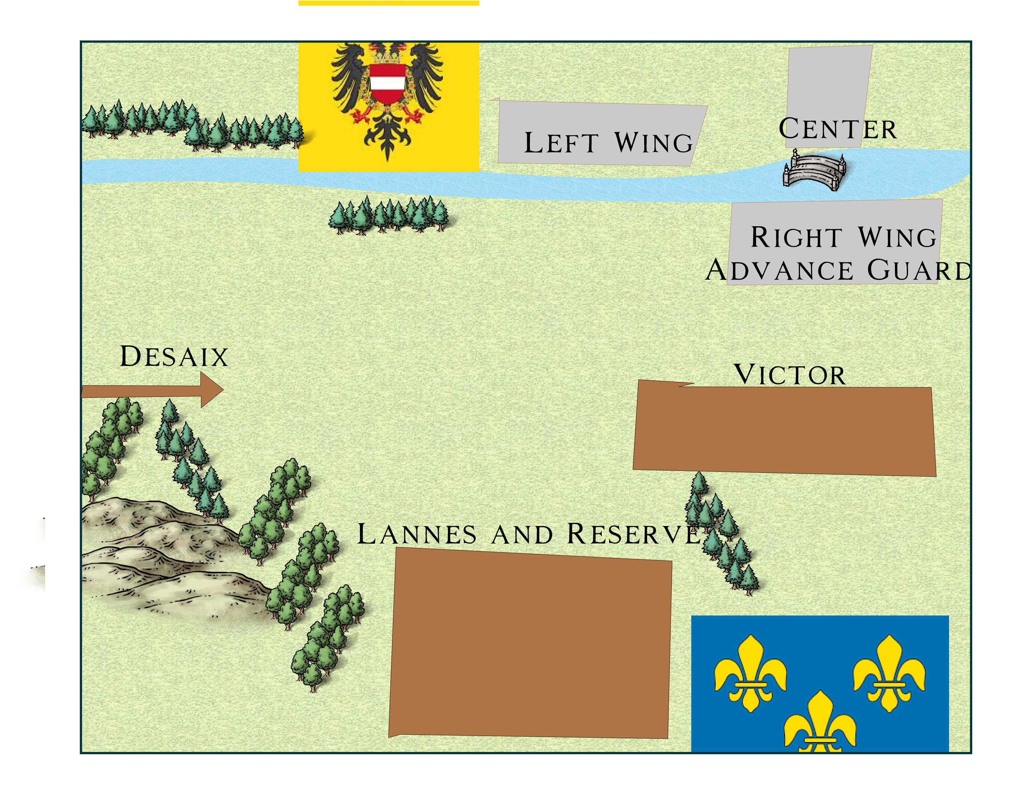 The French should start with the Victor Corps engaged with the advanced guard of the Austrians. Lannes and the Reserve Corps to the rear, and Desaix corps off the table to arrive at turn 10