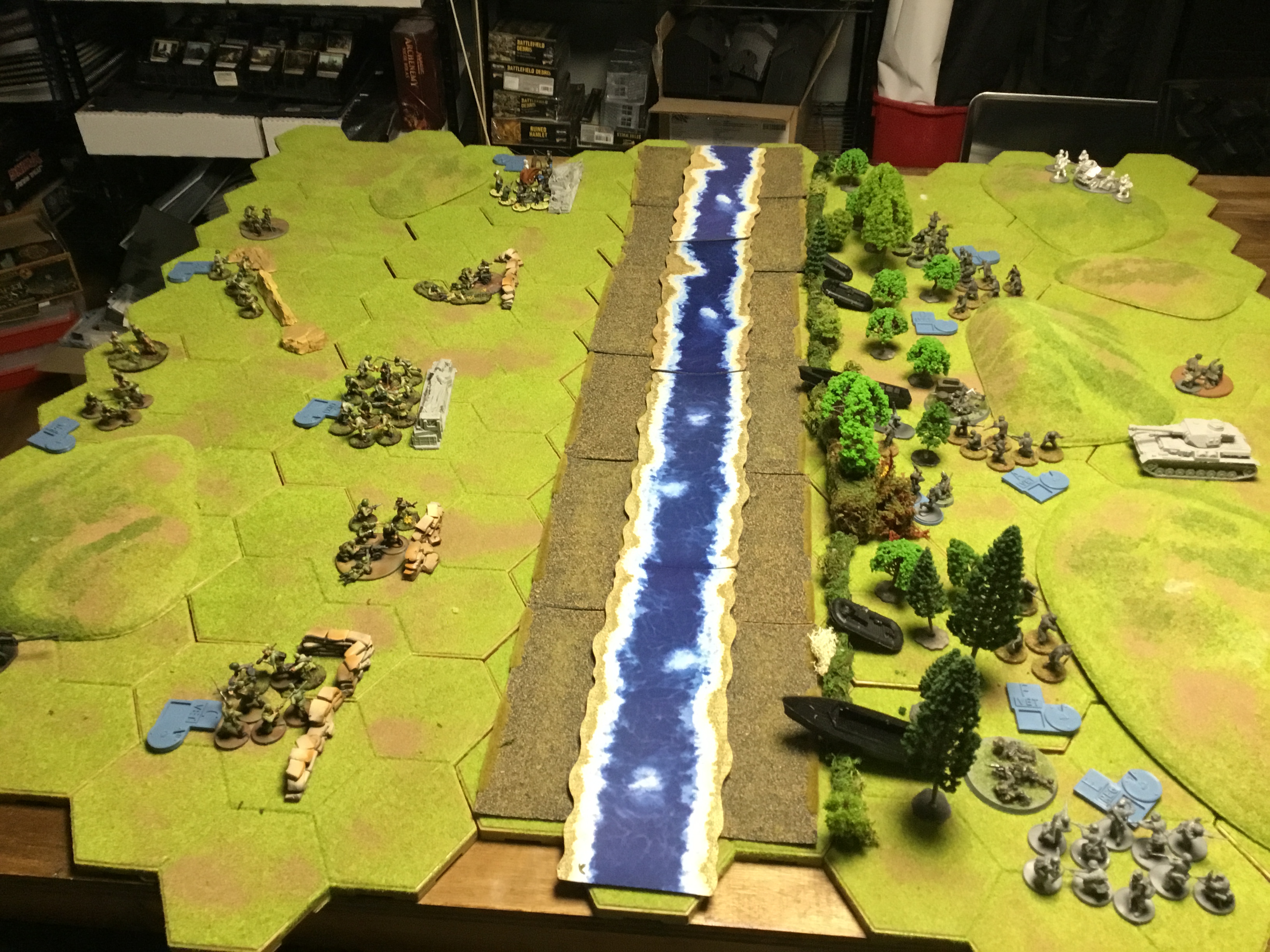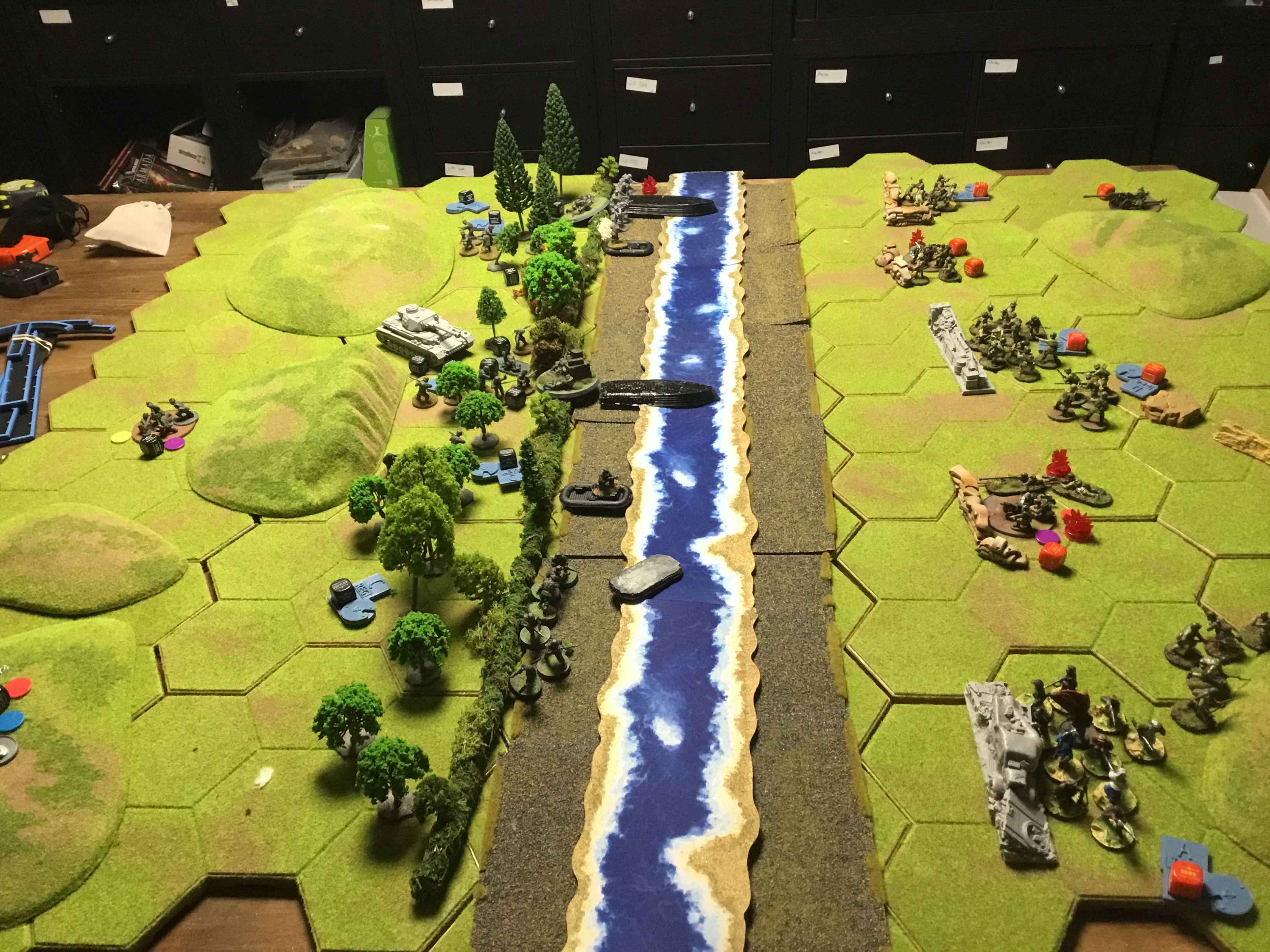 The Soviets have to cross the river they get to VP for each unit to cross. The Germans had to destroy the units and get 1VP for each destroyed unit. The bridge can be rigged to blow by any infantry unit within 3″ of the bridge. If the bridge blows, the Soviets get 5 VP.