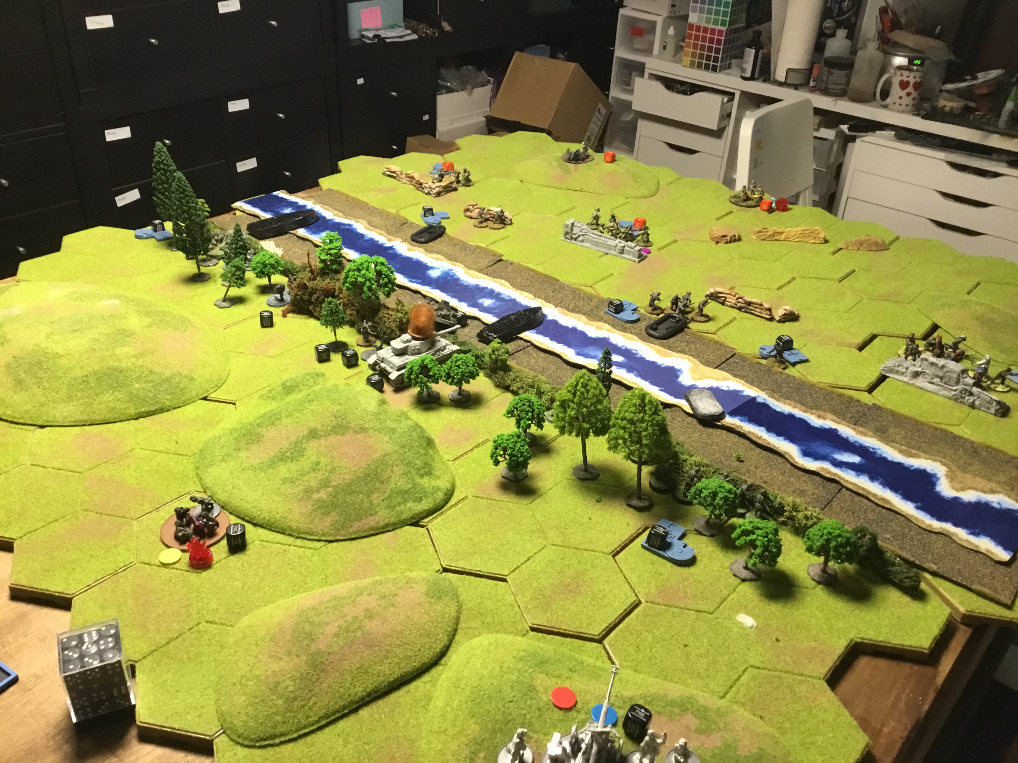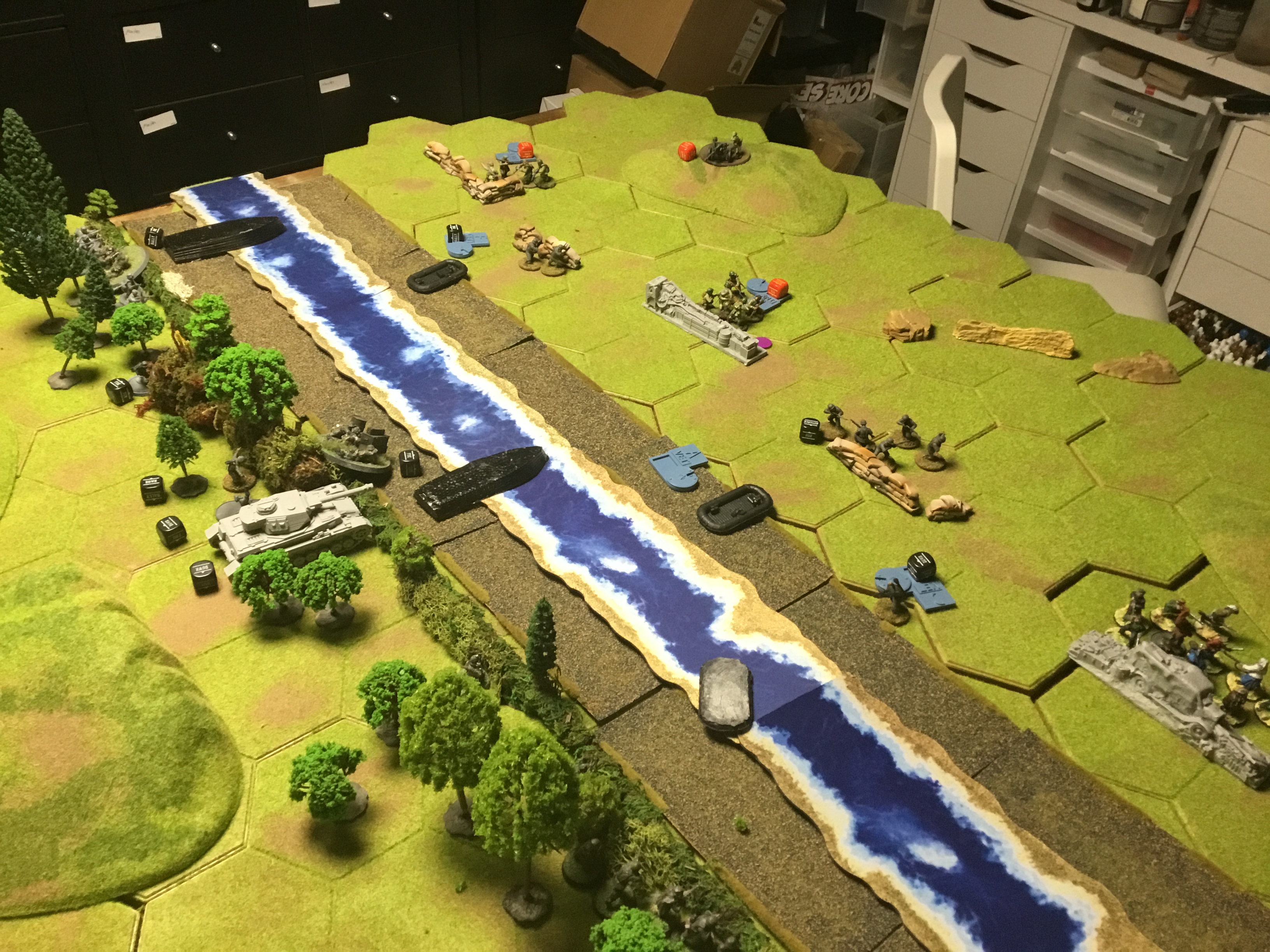 More Soviet casualties as they lay in their foxholes. The AT Gun was able to put the German panzer on Fire. More Germans land on the bank.