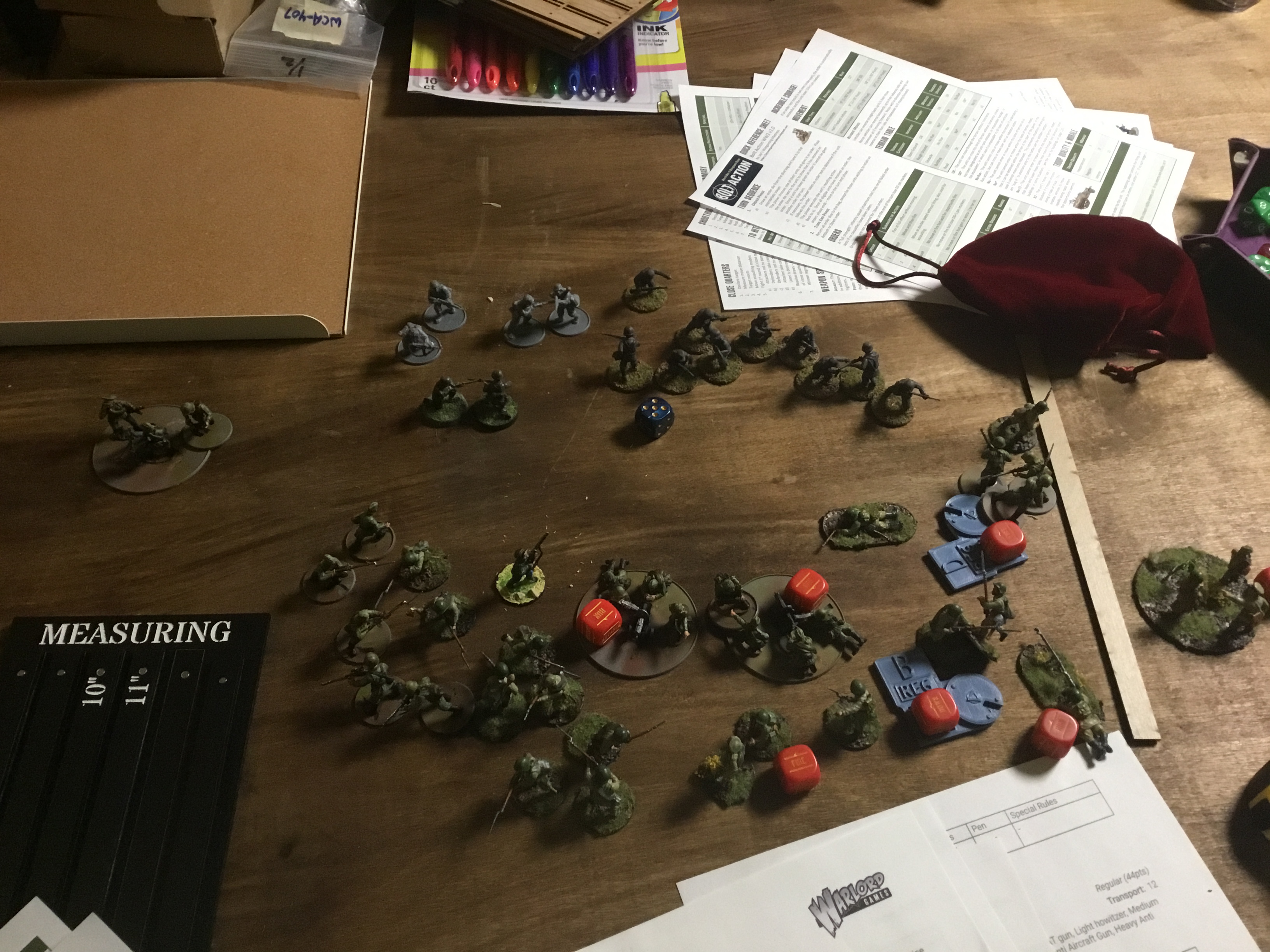 The battle follows night fighting rules The British player gets a single artillery strike that must be in LOS of the commander of his forces. 5″ blast template.