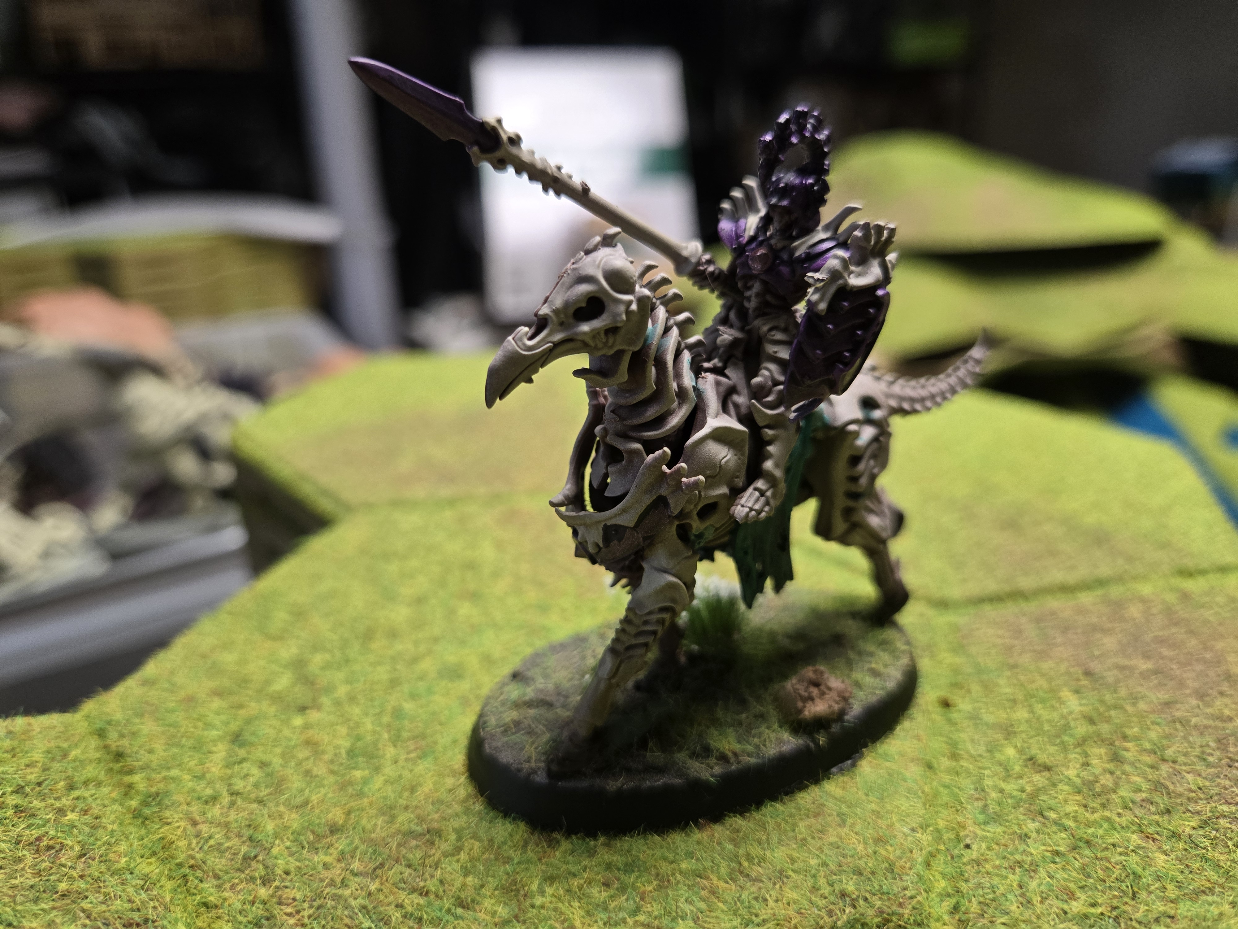 Many of the models have cloth that hangs off the saddle or dangles between their legs. I wanted a contrasting color but didn’t want to spend much time on it, so I used contrast paint Aeldari Emerald with a dry brush of Talisman Green.